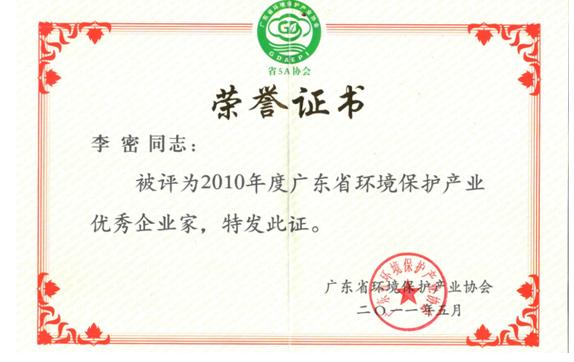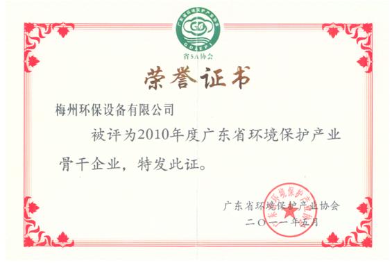为表彰为广东省环保产业协会发展做出突出贡献的优秀企业和企业家,进一步推动广东省环保事业的发展,结合广东省环境保护产业 会开展的全省环保相关产业调查及企业经营状况调研结果,经各地级市环保产业协会推荐、专家评审、并经协会会长会议审核批准,梅州环保设备有限公司被授予“2010年度广东省环保产业骨干企业”荣誉称号,董事长李密同志被授予“2010年度广东省环保产业优秀企业家”荣誉称号。